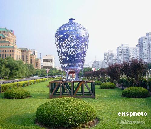 7月20日,一個高4米左右的“青花瓷”瓶奧運花壇在北京長安街亮相,其清新典雅的“芳姿”成為一道別致風景。中新社發 玉龍 攝
