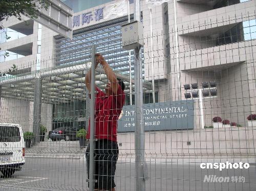 2008年7月27日下午,工作人員正在為美國籃球隊即將入駐的北京金融街洲際酒店架設防護鐵絲網。 中新社發 賴松 攝