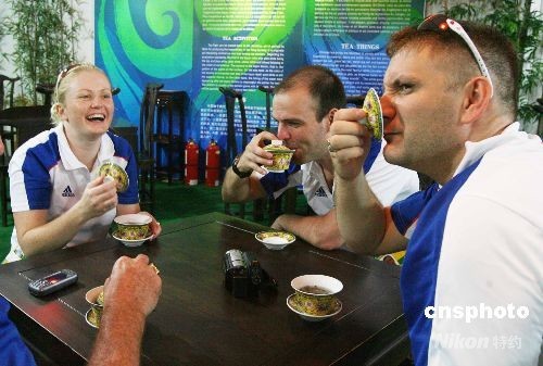7月28日,英國跳水運動員以十分夸張的表情,在北京奧運村國際區輕松品味中國茶文化。中新社發 武仲林 攝
