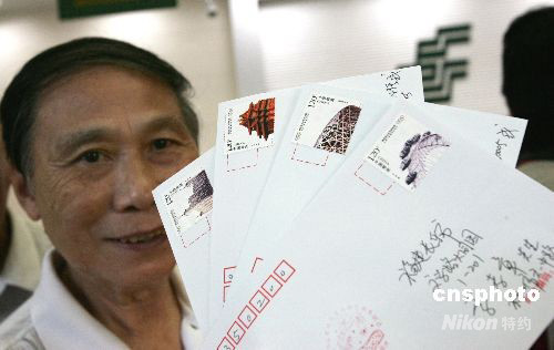 八月二十四日上午,北京奧運會最后一天,一位老伯在福州市郵電大樓高興地拿著剛買到的《奧運會從北京到倫敦》紀念郵票。《奧運會從北京到倫敦》紀念郵票,由中國國家郵政局和英國郵政聯合發行。 中新社發 楊婀娜 攝