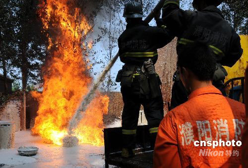 8月28日,河南濮陽市疙瘩廟村一家地下非法小煉油作坊在廢油加工時,操作不慎引發火災。大火炙烤著現場10多個裝滿易燃品的原料罐,并威脅著周圍群眾的生命財產安全。濮陽市消防支隊華龍區大隊官兵接報后,迅速趕到現場,經過1小時激戰,終將大火撲滅。中新社發 劉敬寬 攝