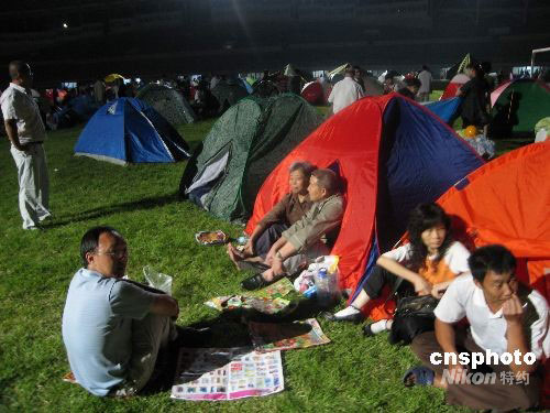 九月一日晚,上千名攀枝花市民在攀枝花體育場搭帳篷過夜。因害怕再次發生余震,許多市民從家里搬到了體育場內。體育場已免費向市民開放,并二十四小時提供熱水。中新社發 劉子倩 攝