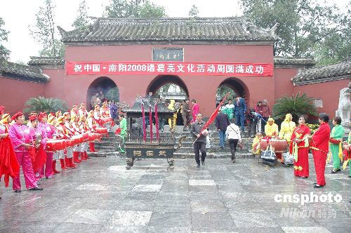 9月27日(農歷八月二十八)是我國古代著名政治家、軍事家諸葛亮仙逝1774年忌日,也是明代世宗皇帝欽定的南陽臥龍崗祭拜諸葛亮的秋祭日。當天上午,以弘揚諸葛亮“鞠躬盡瘁,死而后已”精神為主旨的“中國南陽2008紀念諸葛亮文化活動周”在諸葛亮躬耕地——南陽市臥龍崗武侯祠隆重開幕,吸引眾多國內外的專家、學者和游客前來參觀、朝圣和游覽。9月27日至10月2日“諸葛亮文化周”期間,武侯祠將舉行大型民間藝術表演、漢代樂舞表演、畫家走進臥龍崗、三國謎語有獎競猜、品嘗三國文化宴等豐富多彩的活動。中新社發 熊運彬 攝