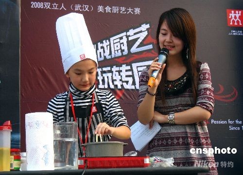2008年10月1日,武漢市漢口航空路一廚藝大賽現場,11歲女童余秋萍上臺和成年人一起比賽烹調技藝。據了解,小學生余秋萍從9歲就開始學習廚藝,經常在家炒菜做飯,認為自己的手藝不錯,就報名參加了這次比賽。中新社發 孫新明 攝