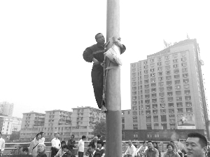 10月21日,一名男子腰綁粗繩,爬上了水西門大橋上的一根路牌桿。他說,他想要討工錢,此舉是為了引起關(guān)注。為了防止桿子太滑,他在自己腰間和兩腳上都綁了粗繩子,以增加摩擦力。當(dāng)民警趕到時,他已爬了兩米高。民警勸說無效,跳起來一拽,把他拽了下來。在記者的協(xié)調(diào)下,工頭劉某承諾,今天就把工錢結(jié)清給他。快報記者 孫玉春 攝