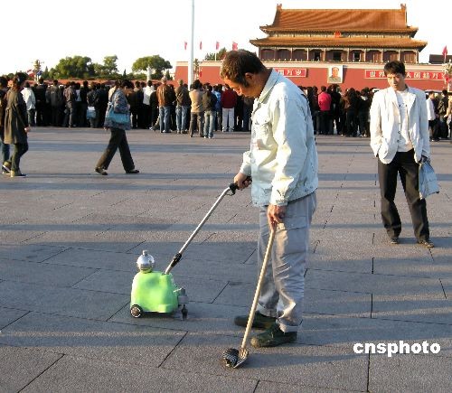 2008年10月26日,一種專門清理口香糖的袖珍電動(dòng)清潔機(jī)亮相北京天安門廣場(chǎng)。圖為環(huán)衛(wèi)工人使用它清洗大理石上的口香糖。中新社發(fā) 玉龍 攝