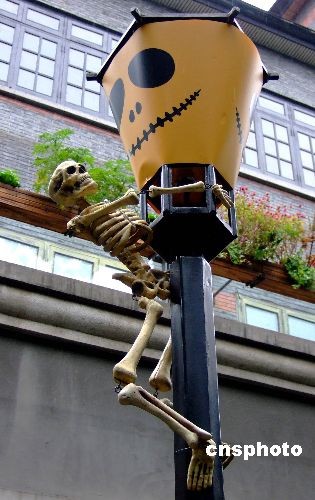 2008年10月29日,為迎接2008萬圣節(jié),上海新天地酒吧街已完成全程置景的設(shè)計(jì)布置,以綿延酒吧街?jǐn)?shù)十處的萬圣置景,為游客“講述不怕鬼的故事”。南瓜頭鬼,白骨嶙峋鬼,美女鬼,小丑鬼……在路邊、酒桌上、樹頂、草地里、燈桿上、石庫門陽臺(tái)間,夸張得有趣,吸引游人目光。中新社發(fā) 蔣振雄 攝
