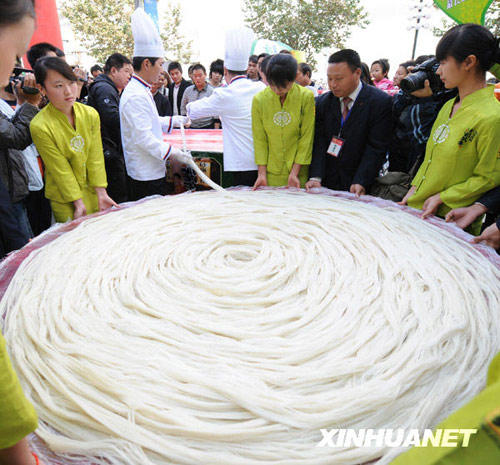 11月2日,一家方便米線生產廠家在鄭州街頭舉行挑戰最長的方便米線活動,商家展示出他們特意加工的一把113根米線,每根長420.4米。