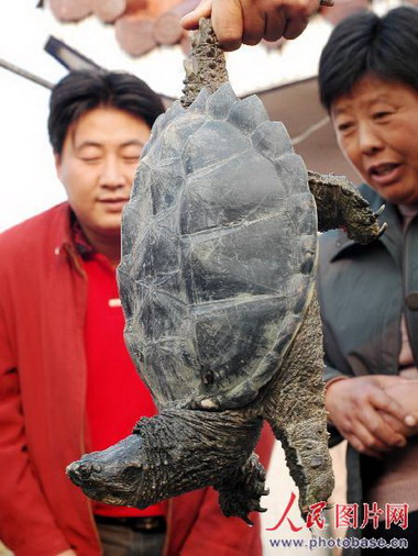 2008年11月4日,一只大“怪”龜引來眾人觀奇。這只重11.4斤的“怪”龜背部像烏龜、腹部像甲魚、尾巴又像穿山甲,是江蘇省姜堰市溱湖風景區湖南村村民孫鳳林上周在湖中扒土時挖出的。據當地水產工程師介紹初步認定,它屬一種相當稀少的大鱷龜,主要生存在南美洲一帶,其生性暴躁、殘忍、什么東西多吃,在水中所向無敵,建議不要進行人工放流。