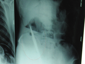 6日上午,記者在徐州礦務(wù)集團(tuán)總醫(yī)院重癥監(jiān)護(hù)室見到了這名男子,目前他雖然已經(jīng)恢復(fù)了意識,但還不能開口說話,需要呼吸機(jī)輔助呼吸。據(jù)醫(yī)生介紹,4日中午12時(shí)左右,這名男子因服毒輕生被緊急送到醫(yī)院進(jìn)行搶救,之前,這名男子已經(jīng)在當(dāng)?shù)剜l(xiāng)鎮(zhèn)醫(yī)院進(jìn)行了近20小時(shí)的治療,但效果不佳。“病人被轉(zhuǎn)院到礦總院時(shí)已神志不清,血壓極低,處于休克狀態(tài)。”救護(hù)人員給男子洗胃、初步處理以后,發(fā)現(xiàn)男子呼吸急促,于是趕緊給他拍片檢查。結(jié)果讓所有的醫(yī)生大吃一驚,竟有一把尖狀異物橫在該男子腹腔內(nèi)!當(dāng)天下午5時(shí)30分,輕生男子被推上了手術(shù)臺。經(jīng)過40多分鐘的手術(shù),該男子腹腔被打開,手術(shù)醫(yī)生發(fā)現(xiàn),男子體內(nèi)的金屬狀異物竟然是一把長19厘米的尖刀!