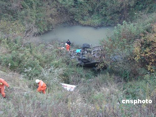 11月12日下午5時許,一輛從貴州省六盤水市駛往畢節(jié)地區(qū)威寧縣的貨車在102省道威寧縣境內(nèi)張家村一轉(zhuǎn)彎道突然失控,一頭將路邊的防護石墩撞垮,翻下50余米高的山谷,當場造成2人受傷,1人遇難。中新社發(fā) 潘立遠 攝