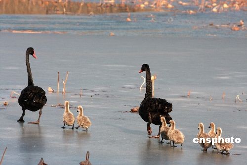 12月14日,北京圓明園,一對黑天鵝夫婦帶著8只未滿月的天鵝寶寶在享受著北京冬日溫暖的陽光。據介紹,8只小黑天鵝是11月22日出生。中新社發 鄭雄增 攝