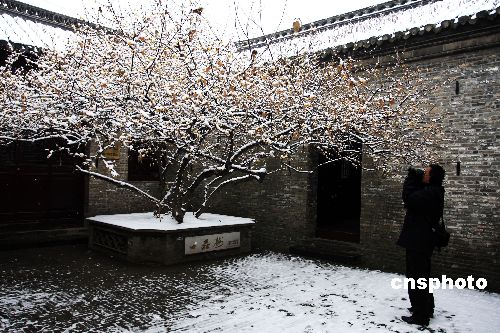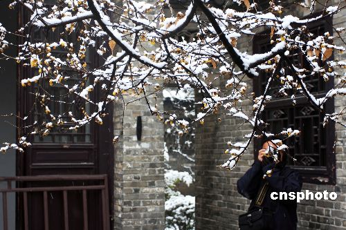 2008年1月6日,江蘇省淮安市迎來新年第一場大雪,在該市周恩來童年讀書處,由少年時代周恩來親手種植的百年臘梅傲雪盛開。中新社發 徐洪云 攝