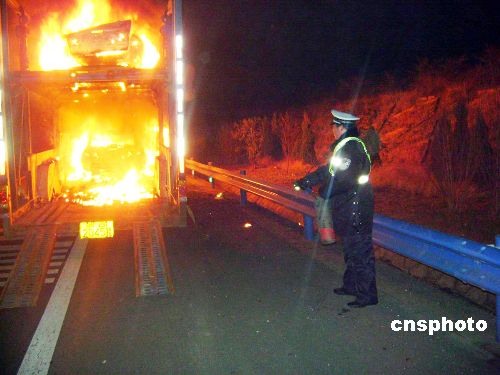 1月10日凌晨,一輛運載著8輛海南馬自達轎車的大貨車,在湖北樊魏高速公路上無故起火,除搶救出一臺轎車外,其余7臺“海馬”燒成空殼。原來,駕駛員李某準備將8輛海南馬自達3型轎車從重慶運往吉林,途中發現裝有兩層車的下層,有一臺馬自達轎車起火,李某驚慌之下急忙救火。在民警的幫助下,駕駛員搶出一輛未著火的轎車,其余7輛轎車全部燒得只?諝。民警現場調查發現,火是起自下排一臺小轎車,懷疑是轎車自燃,但轎車本身并未發動,究竟如何起火,讓民警和司機都納悶不已。目前,該事故成因正在調查中。 中新社發 李得榮 攝
