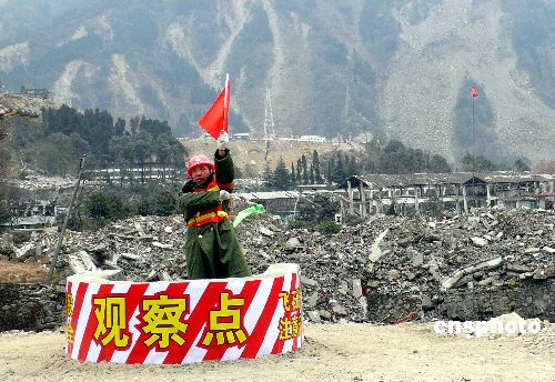 1月23日(臘月二十八),四川省都汶公路(都江堰市至汶川縣)漩口鎮段,一名飛石路段安全觀察員在寒風中指揮車輛通行。在四川山區飛石路段,交通部門設置的安全觀察哨不僅保障了過往車輛的安全,還帶給人們陣陣溫暖。中新社發 張曉理 攝