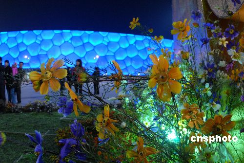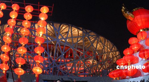 2009年1月31日晚,北京奧林匹克公園迎來的首個(gè)春節(jié)已過半,但喜慶氣氛依然高漲,游人絡(luò)繹不絕。最為醒目的是景觀大道兩側(cè)布置兩組15米高的燈籠墻——2800個(gè)大紅燈籠一字排開。此外,“金牛獻(xiàn)福”、“年年有余”、“鴻福滿倉”等鋼材結(jié)構(gòu)的雕塑,被安放在園區(qū)人流較集中的地方。中新社發(fā) 胡慶明 攝