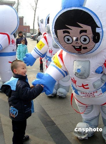 2月4日,《飛天壯歌——中國首次太空漫步航天展》新聞發(fā)布會現(xiàn)場,河北兒童與扮成“航天員”的工作人員握手。《飛天壯歌——中國首次太空漫步航天展》全國巡展即將于2月13日在河北省石家莊市啟動。主辦方稱,這是中國航天史上規(guī)模最大、規(guī)格最高的航天尖端科技成就展,將有大量神七航天實物現(xiàn)場展出,包括神七宇宙飛船返回艙、價值三千萬元人民幣的宇航員艙外航天服、火箭整流罩殘骸,以及翟志剛遨游太空出艙時揮舞的國旗等重要實物。中新社發(fā) 牛琳 攝