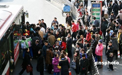 2009年2月16日,北京西站再次迎來客流高峰,抵京的乘客“擠爆”火車站外的公交車站。在返京的客流中,學生流占據了返程的主導。中新社發 任丘 攝
