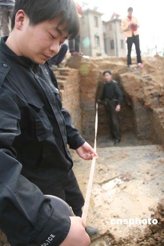 3月16日,施工人員在正在興建的安徽巢湖北外環施工工地發現兩座古墓。發掘的兩座古墓被確證為東漢晚期墓,其中一古墓葬為土坑墓,另一座為磚坑墓。據該市文管所同志介紹,這兩座漢墓均被盜過,而且被盜一空,在發掘時,發現盜墓賊留下一個很大的盜洞,直通墓中央。從盜墓賊盜墓的舉動和第二座漢墓墓磚結構及墓磚上的花紋判斷,此墓墓主應該有些身份,多少有些隨葬品,然而,發掘人員除了發掘出一些瓦罐的碎片,挖出惟一一只完整的陶罐。此只陶罐不是在墓坑挖出的,而是在墓坑外二十公分處。據文管所同志分析,此罐可能是后人祭祀留下的,或是盜墓賊丟下的。中新社發 李遠波 攝