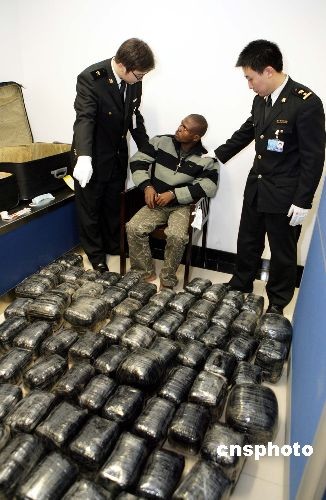 近日,北京首都機場海關在一男性旅客的行李中查獲毒品大麻可疑物72包,毛重87.25公斤。此案是首都機場海關旅檢現場今年首次查獲采用大批量客帶貨方式走私毒品入境案。嫌疑人在通關過程中采用極為少見的運帶方式運帶毒品。中新社發 雷虹 攝