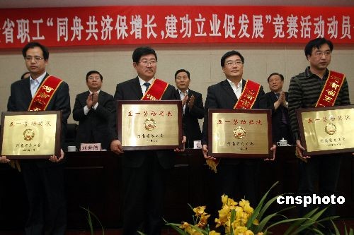 2009年3月19日,“河南省五一勞動獎”表彰大會在鄭州舉行,52個集體獲得“河南省五一勞動獎狀”,121名先進個人獲得“河南省五一勞動獎章”。河南省副省長史濟春為獲表彰人員頒獎。中新社發 陳代述 攝