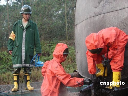 3月23日清晨,廣西南北高速公路那麗出口處,一輛運載蔬菜的貨車與一輛裝載瀝青的槽車追尾,造成貨車上3人被困,槽車上大量瀝青泄漏,流向當?shù)匾伙嬘盟唇印=?jīng)過欽州消防人員3個小時的艱辛奮戰(zhàn),瀝青終于被成功堵截,未流入河中。中新社發(fā) 田華松 攝