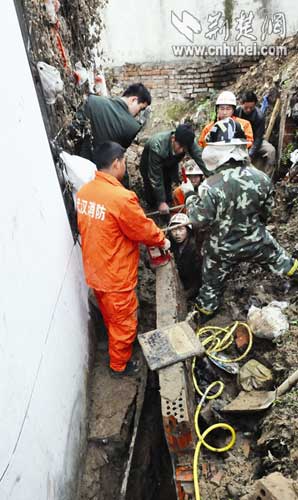 為保證被困人員安全同時防止第二次塌方,消防員迅速找來四根粗大的木料,將周邊松動的水泥墻死死頂住。實施救援時,消防員首先嘗試用風鎬鑿碎溝底的水泥管,幾分鐘后很快鑿穿,不料余師傅的右腿依然動彈不得;接著找來兩個氣墊,通過腳踩增壓,以求擴大余師傅右腿所在的空間,結果效果不理想;繼而又找來千斤頂,還是無濟于事。發現只有吊起坍塌的墻體,才能從根本上解決問題。于是調來吊車,隔著院墻伸出吊臂,正好坍塌墻體上有個排水孔,消防員設法將鋼絲繩繞過了排水洞。吊車司機小心翼翼地操作,既要減輕被夾者的痛苦,又要繞過坍塌現場的線纜,而且盡可能在起吊過程中確保墻體不能斷裂。幸好,起吊墻體四周泥土較為松軟,11時20分左右,墻體被成功吊起,消防戰士迅速將余師傅抱出水溝。劉蔚丹 饒純武 黃康 攝
