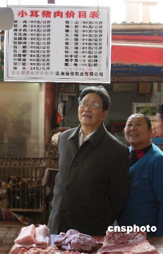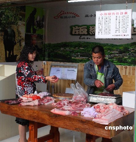 近日,產(chǎn)自云南西雙版納的珍稀品種小耳豬在昆明上市,每公斤瘦肉標(biāo)價九十八元,被市民稱為“天價”豬肉。版納小耳豬具有2000多年歷史,是全國唯一由本土野豬馴化而來的本地豬種,2002年被列入《國家級畜禽品種資源保護名錄》,由西雙版納當(dāng)?shù)厣贁?shù)民族在原始森林放養(yǎng),是真正的“生態(tài)豬肉”。甫一上市,便受到不少昆明市民的青睞。圖為來購買小耳豬肉的昆明市民。中新社發(fā) 劉冉陽 攝