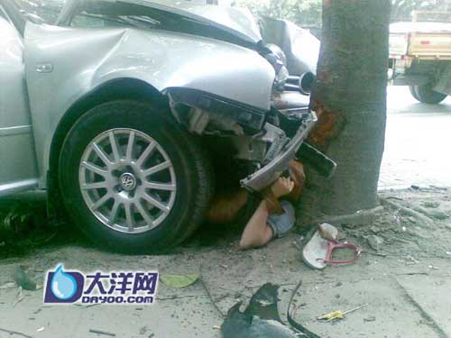 事發時,徐師傅正在檔口吃飯,“砰”地一聲巨響,差點將他手中的碗筷震落。他沖出來一看,一位少女被壓在銀灰色轎車的下邊,甚至沒有呻吟聲,便動彈不得了;一位40歲左右男子左腿生生被壓斷,躺在血泊里呻吟,另一位25歲左右的女子抓住他的手,叫他救救她。