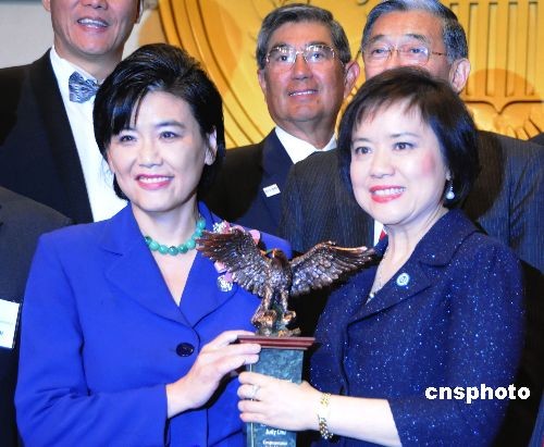 七月二十三日晚,國際領袖基金會在華盛頓舉行頒獎晚會,獎勵杰出的亞裔人士,在美國國會中僅有的兩名華裔議員吳振偉、趙美心分別獲得“年度杰出公職服務獎”。圖為美國“國際領袖基金會”執行長、曾任美國商務部少數族裔發展署副署長兼幕僚長的華裔政界名媛董繼玲(右),向美國華裔女眾議員趙美心頒獎。國際領袖基金會為全美最著名的亞裔青年領袖訓練機構,每年定期表揚促進國際經貿繁榮、發揚中華文化傳承有卓越成就的杰出人士。中新社發 吳慶才 攝