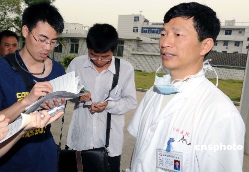 6月1日,福州市肺科醫(yī)院副院長林鐘軒(右)在接受記者采訪時表示:福建省第四例甲型H1N1流感患者經(jīng)過治療目前病情有所好轉(zhuǎn)。該患者,男,22歲,美國籍,在美國一企業(yè)工作。5月26日從紐約乘機經(jīng)溫哥華至香港,在香港轉(zhuǎn)乘KA660航班,北京時間28日上午抵達福州長樂國際機場。30日上午因發(fā)熱、咳嗽就診連江縣琯頭衛(wèi)生院,測體溫38.3℃。31日凌晨轉(zhuǎn)至福州肺科醫(yī)院隔離治療,入院測體溫39.3℃,伴咳嗽、頭痛、咽痛等流感樣癥狀。30日晚上福州市疾病預防控制中心對患者鼻咽拭子標本進行了檢測,結(jié)果為甲型H1N1流感病毒核酸陽性。省衛(wèi)生廳專家組根據(jù)患者的臨床表現(xiàn)、流行病學史和實驗室檢測結(jié)果,按照衛(wèi)生部制定的診療方案,判定該病例為甲型H1N1流感確診病例。相關(guān)情況已經(jīng)報告衛(wèi)生部。中新社發(fā) 劉可耕 攝