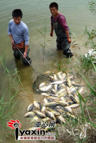 6月3日上午,記者在養殖戶們的魚池旁看到,工人們正在打撈池中不斷浮出水面的死魚,在此之前,四家養殖戶總共有近10噸的死魚被拉走,這些魚只能作為死魚賤價銷售,加上未打撈的沉在池底的死魚,總共的損失有幾十萬元。
