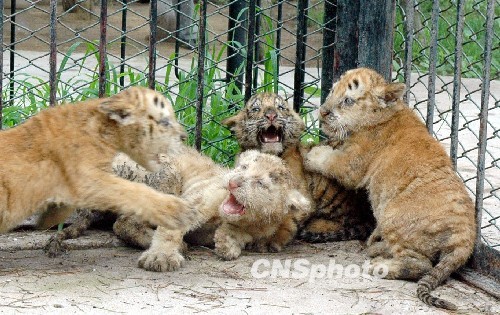 7月20日,在濟(jì)南野生動(dòng)物世界,剛出生2個(gè)月的四胞胎小老虎首次走出產(chǎn)房與游客見面。據(jù)了解,該景區(qū)飼養(yǎng)的孟加拉虎“虎妞”于5月10日產(chǎn)下四胞胎,其中兩只是金虎,一只雪虎,一只孟加拉虎,專家介紹,一胎產(chǎn)下3個(gè)品種的虎崽,在國內(nèi)還是首次出現(xiàn)。另據(jù)了解,虎有3種基因的顏色,黑色、黃色和白色,其中黑色與黃色是顯性基因,白色為隱性基因,當(dāng)黃色基因不能表達(dá)時(shí),被白色基因掩蓋,就生出白虎,黑色與黃色基因都沒有表達(dá)時(shí),白色基因就成為顯性基因,就生出雪虎,當(dāng)白色與黑色基因變成隱性基因時(shí),就會(huì)生出金黃色的虎,也稱為“金虎”。中新社發(fā) 龔輝 攝