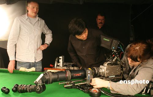 圖為拍攝準備時,丁俊暉(中)在“研究”攝像機。