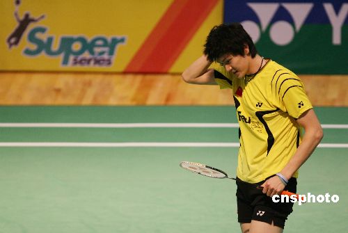 十一月二十九日,二零零七中國香港羽毛球超級賽進(jìn)行正賽第二輪的比賽,男單三號種子選手鮑春來因?yàn)橛夷_腳踝有傷宣布放棄比賽。中新社發(fā) 武仲林 攝