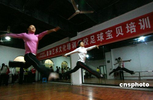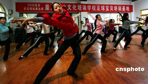 1月15日,東亞女足的“足球?qū)氊悺眰冊谟?xùn)練。2008年東亞女足錦標賽將于2月17日-24日在重慶市永川區(qū)體育中心舉行,永川區(qū)從該區(qū)大中院校選出42名“足球?qū)氊悺保M行為期一個月的藝術(shù)體操、姿態(tài)等基本功訓(xùn)練,屆時將以嶄新身姿展現(xiàn)在人們面前。中新社發(fā) 陳仕川 攝