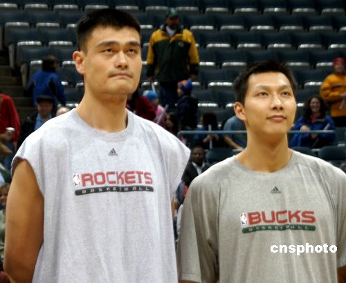 當地時間二月二日,由姚明領軍的NBA休斯頓火箭隊作客密爾沃基,挑戰另一位中國球員易建聯所效力的雄鹿隊。此為火箭和雄鹿在本賽季的第二次交鋒。姚明(左)和易建聯(右)賽前互致問候并合影。中新社發 李靜 攝