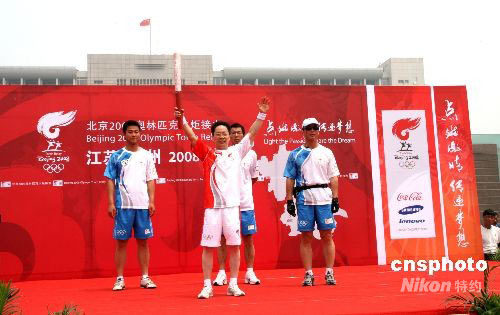 5月26日上午,奧運圣火在泰州開始傳遞。共有104名火炬手、23名護跑手在3個小時內(nèi)合力跑完12.8公里的傳遞路程。圣火從百年名校江蘇省泰州中學開始出發(fā),途經(jīng)桃園、梅蘭芳紀念館等地最終到達泰州市人民廣場。圖為舉重世界冠軍周培順為最后一棒火炬手。中新社發(fā) 崔佳明 攝