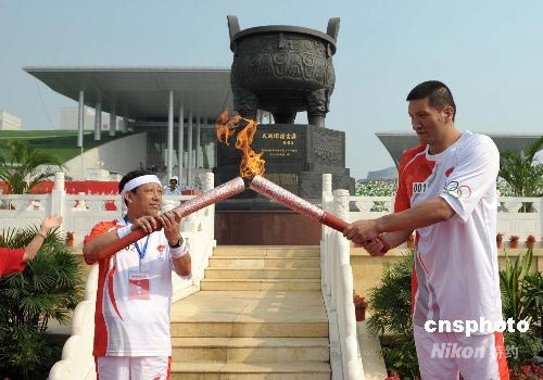 7月8日,奧運(yùn)火炬在內(nèi)蒙古呼和浩特市進(jìn)行傳遞,曾在美國(guó)參加NBA聯(lián)賽并獲得過(guò)總冠軍的中國(guó)著名蒙古族籃球中鋒巴特爾傳遞首棒火炬。 圖為巴特爾在民族團(tuán)結(jié)鼎前和湯愛(ài)軍交接奧運(yùn)火炬。中新社發(fā) 廖攀 攝