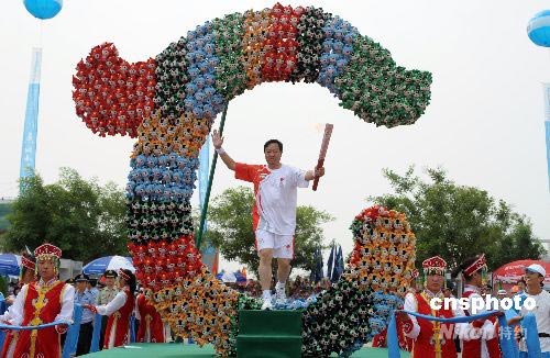 7月10日,奧運火炬在內蒙古赤峰市進行傳遞;鹁媸钟诮ㄔO穿過用福娃組成的“玉龍”。在赤峰翁牛特旗出土的紅山文化標志性文物——玉龍,被史學界定為“中華第一龍”。中新社發 廖攀 攝