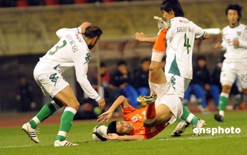 2008年10月11日,中國足球超級聯賽第21輪在山東濟南的一場比賽中,主場作戰山東魯能2:1險勝浙江綠城隊。中新社發 張侃 攝