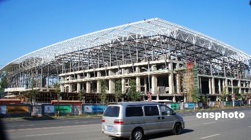 2008年11月8日,沈陽(yáng)奧體中心綜合體育館已現(xiàn)形。該館可容納8000名觀眾,可滿(mǎn)足羽毛球、乒乓球、體操、拳擊等賽事對(duì)場(chǎng)館的要求,還可舉辦大型音樂(lè)會(huì)、演唱會(huì)。沈陽(yáng)奧體中心建筑群“一場(chǎng)三館”,由奧體中心一座體育場(chǎng)、一座綜合體育館、一座游泳館和一座網(wǎng)球館組成。中新社發(fā) 劉寶成 攝