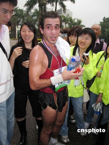 “九洲杯”珠海首屆半程馬拉松邀請賽于二十二日早上八點鳴槍起跑,該項賽事吸引了境內外兩千名長跑愛好者參加。經過一番角逐,本次半程馬拉松賽的男子總冠軍由亞洲半程馬拉松紀錄保持者、香港選手史提芬奴贏得,女子總冠軍則由十六歲的中國籍女孩楊麗文奪得。圖為史提芬奴在結束比賽后接受記者的訪問。中新社發 鄧媛雯 攝
