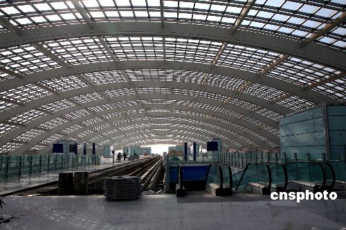 2007年11月6日,北京首都機場輕軌“3號航站樓站”接近尾聲,該車站位于首都機場3號航站樓前的交通中心內(nèi),旅客可通過扶梯直達3號航站樓。機場線全長28.1公里,自西向東共設(shè)置了4座車站,起點站——“東直門站”與地鐵2號線和13號線互為換乘站,另外還包括三元橋站(與10號線互為換乘站)和“2號航站樓站”(位于2號航站樓與停車樓之間的綠地及現(xiàn)狀道路之下,旅客可經(jīng)通道直達2號航站樓)。該工程預計2008年4月建成,7月1日開始載客試運營。屆時,機場輕軌最高運營速度100公里/小時,東直門至首都機場運行時間為16分鐘。中新社發(fā) 洪濤 攝
