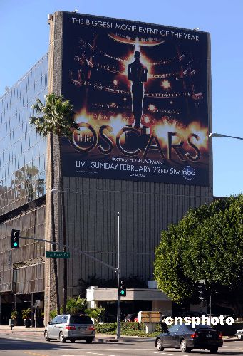第八十一屆奧斯卡電影金像獎官方海報一月二十九日正式公布,一幅巨型官方海報懸掛在位于好萊塢的美國電影藝術與科學學院大樓外。海報以黑色與金色為基調,以奧斯卡頒獎現場“柯達劇院”的舞臺作為主要背景,“小金人”的剪影在金色光芒的映襯下顯得莊重而大氣。中新社發 張煒 攝