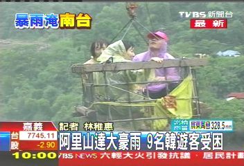 中新網7月28日電 據臺灣TVBS報道,西南氣流造成阿里山雨量達大豪雨標準,部分村落聯絡便道被沖毀,有9名韓籍游客,受困在山美村達娜伊谷,當地消防隊打算以流籠接駁方式協助。