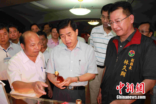 中新網(wǎng)苗栗8月19日電 廣東省省長黃華華率領(lǐng)的廣東經(jīng)貿(mào)文化交流團主圖19日從新竹抵達苗栗縣參觀訪問。黃華華在當?shù)仡I(lǐng)導(dǎo)人的陪同下參觀了農(nóng)莊、當?shù)靥禺a(chǎn)銷售商場。當看到當?shù)赜貌葺庸ぶ圃斓牟葺称妨宅槤M目,充滿貨架時大為贊賞,稱贊苗栗“了不得”。圖為黃華華在苗栗領(lǐng)導(dǎo)人的陪同下,觀看正在發(fā)售中的草莓酒。