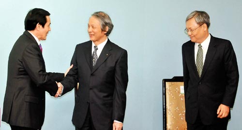 馬英九(左)昨天舉行臨時(shí)記者會(huì),宣布提名賴浩敏(中)與蘇永欽(右)為“司法院”正、副院長,會(huì)后向兩人握手致意。圖片來源:臺(tái)灣聯(lián)合報(bào)