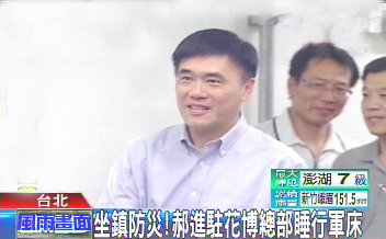 中新網9月19日電 據臺灣TVBS電視臺報道,臺北市長郝龍斌18日晚間進駐花博營運總部,聽取最新臺風動態簡報,簡報結束后,直接安排在總部過夜,就睡在一張簡單的行軍床上,隨時做好機動準備。