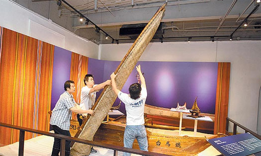 “國(guó)史館”接收后,花了近二十萬元修復(fù)。這次展覽,“臺(tái)馬號(hào)”因體積龐大,只能平放船身,無法豎起藤編的船帆。